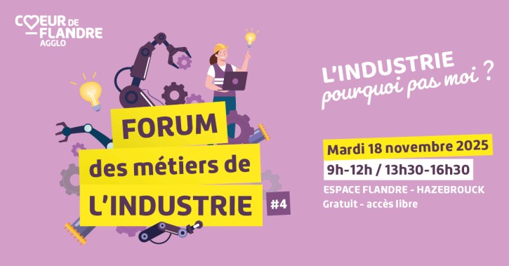 Rendez-vous mardi 18 novembre pour la 4ème édition du Forum des Métiers de l'Industrie ! Avec plus de 40 stands, des ateliers et animations, retrouvez les formations ainsi que les entreprises du secteur de l'Industrie en Cœur de Flandre.