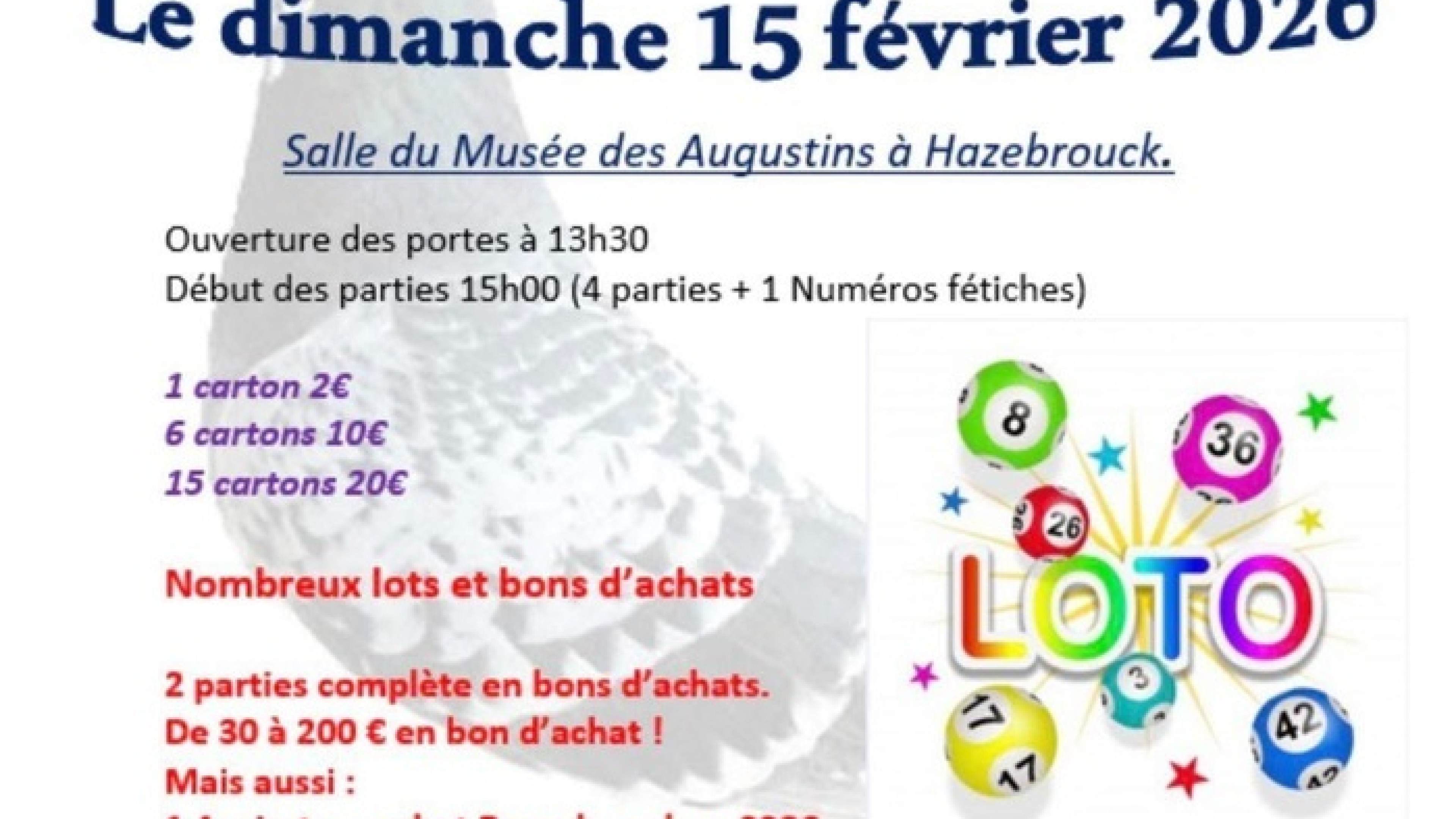 Les colombophiles d'Hazebrouck organise leurs Loto annuel qui est prévu le dimanche 15 février 2026 à la salle du musée des Augustins à Hazebrouck. Réservations souhaitées au 06.64.82.63.01