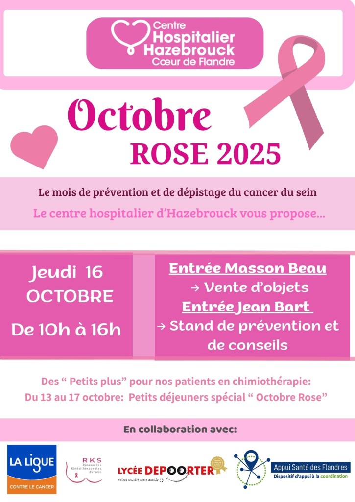 Pour en savoir plus sur ces actions, rendez-vous jeudi 16 octobre de 10h à 16h au centre hospitalier d’Hazebrouck, entrée Jean Bart : un stand de sensibilisation, de prévention et de dépistage sera présent avec la participation de l’espace ressource cancer, de la ligue contre le cancer, du lycée Depoorter, et du réseau de kiné RKS (Réseau des Kinés du Sein).